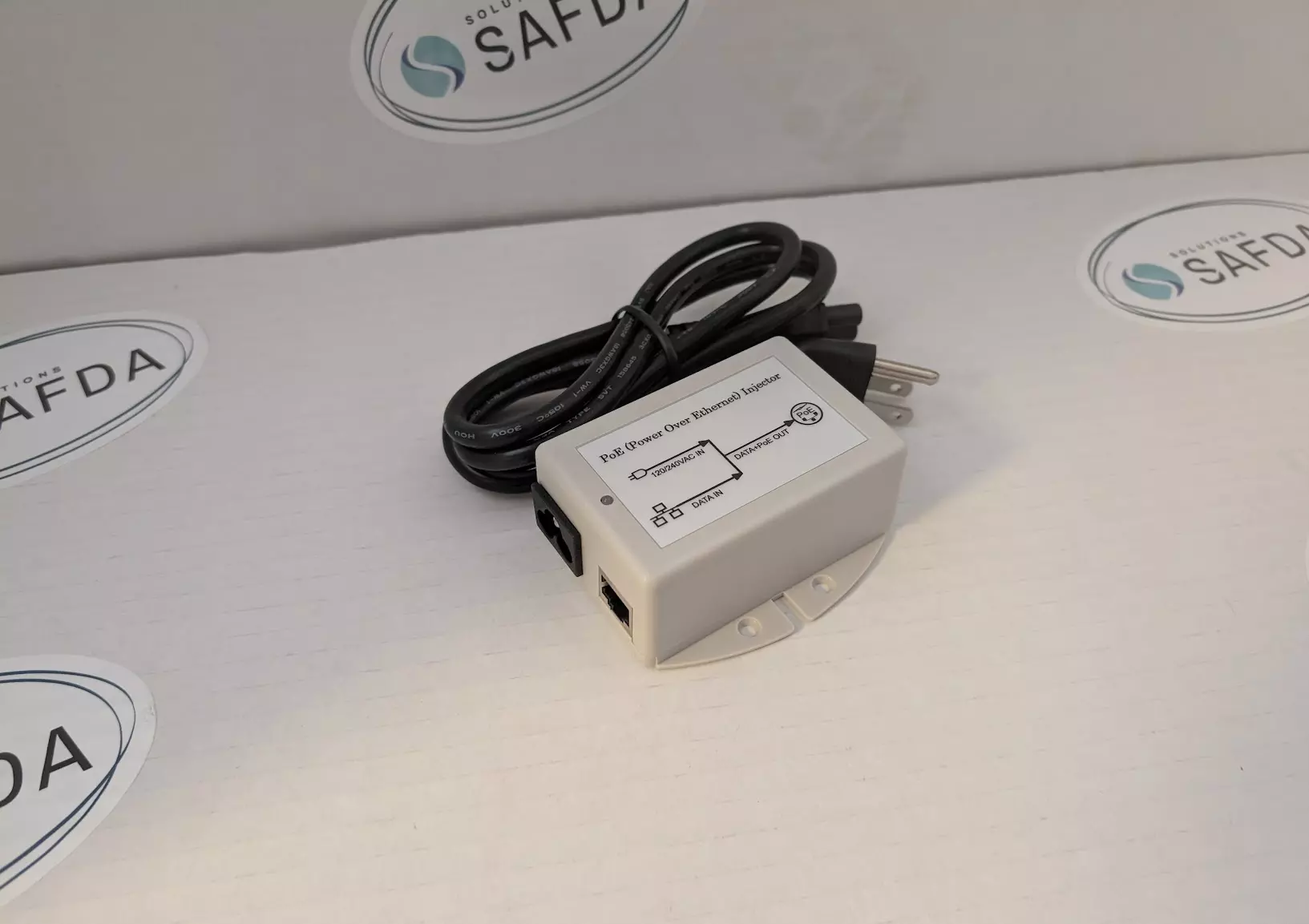 48 VDC passive PoE injector designed to supply power and data over Ethernet to compatible devices, supporting 10/100 Mbps data pass-through with integrated over-current and short-circuit protection.